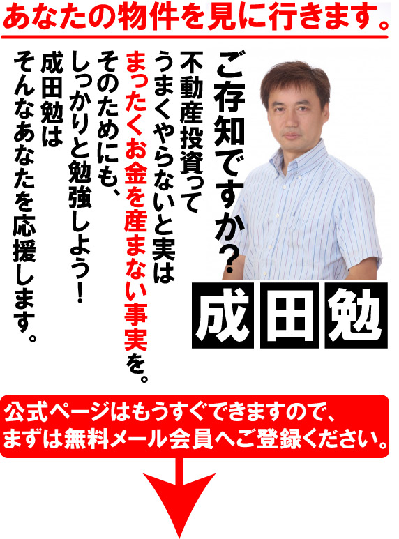 今や資産作りの定番となった感のある不動産投資ですが、しっかりと勉強しないとあなたの味方にはなってくれません。メール会員の皆様へは楽しく学べる不動産投資のノウハウをご提供いたします。 ※ただいま入会頂いた方へもれなく無料レポート「空室率50%超のエリアで満室を実現したオーナーの入居者募集方法」をプレゼント中です。